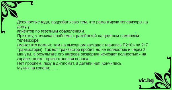 клиентов по газетным объявлениям. Прихожу, у мужика проблема с развёрткой на цветном ламповом телевизоре (может кто помнит, там на выходном каскаде ставились П210 или 217 транзисторы). Так вот транзистор пробит, но не полностью и через 2 минуты, в результате его нагрева развёртка исчезает полностью - на экране только горизонтальная полоса. Нет проблем, лезу в дипломат, а детали нет. Кончились. Мужик на колени: ... мастер, через 10 минут матч по футболу, ну как-нибудь родненький помоги... И тут эврика. Ухожу домой обещая придти на следующий день, мужик болеет за команду, а на телевизоре в мыльнице наполненной водой выводами кверху на 40 сантиметровых проводах лежит транзюк. Прошло три года. На улице меня за рукав дёргает дядька и радостно орет: Привет!!! А ничего что он в накипи стал? Может его почистить??? .... Смотрю на него не узнавая и тут вспомнил. А дядька продолжает: я так уже привык, водички из кувшинчика подольёшь и норма - уже как-то привык.