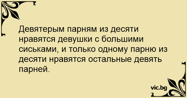 Девятерым парням из десяти нравятся девушки с большими сиськами, и только одному парню из десяти нравятся остальные девять парней.