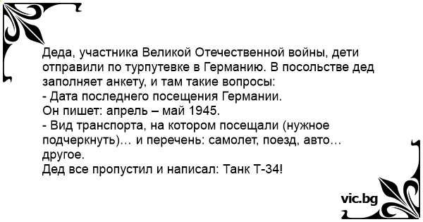 Деда, участника Великой Отечественной войны, дети отправили по турпутевке в Германию. В посольстве дед заполняет анкету, и там такие вопросы:
