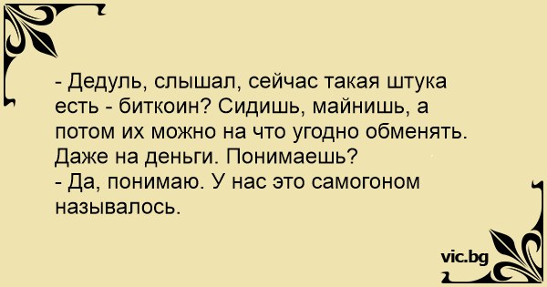 - Дедуль, слышал, сейчас такая штука есть - биткоин? Сидишь, майнишь, а потом их можно на что угодно обменять. Даже на деньги. Понимаешь?