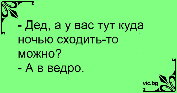 Внучка приехала к бабушке в деревню. - Бабушка, а куда тут у вас вечером ходят? - Да вон ведро в углу.