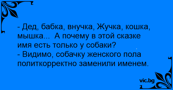- Дед, бабка, внучка, Жучка, кошка, мышка... А почему в этой сказке имя есть только у собаки?<br />- Видимо, собачку женского пола политкорректно заменили именем.