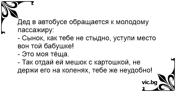 - Сынок, как тебе не стыдно, уступи место вон той бабушке!