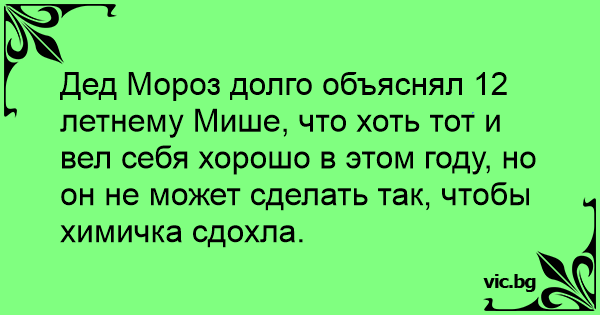 Дед Мороз долго объяснял 12 летнему Мише, что хоть тот и вел себя хорошо в этом году, но он не может сделать так, чтобы химичка сдохла.