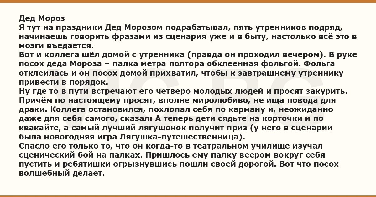 Дед Мороз Я тут на праздники Дед Морозом подрабатывал, пять утренников подряд, начинаешь говорить фразами из сценария уже и в быту, настолько всё это в мозги въедается. Вот и коллега шёл домой с утренника (правда он проходил вечером). В руке посох деда Мороза – палка метра полтора обклеенная фольгой. Фольга отклеилась и он посох домой прихватил, чтобы к завтрашнему утреннику привести в порядок. Ну где то в пути встречают его четверо молодых людей и просят закурить. Причём по настоящему просят, вполне миролюбиво, не ища повода для драки. Коллега остановился, похлопал себя по карману и, неожиданно даже для себя самого, сказал: А теперь дети сядьте на корточки и по квакайте, а самый лучший лягушонок получит приз (у него в сценарии была новогодняя игра Лягушка-путешественница). Спасло его только то, что он когда-то в театральном училище изучал сценический бой на палках. Пришлось ему палку веером вокруг себя пустить и ребятишки огрызнувшись пошли своей дорогой. Вот что посох волшебный делает.