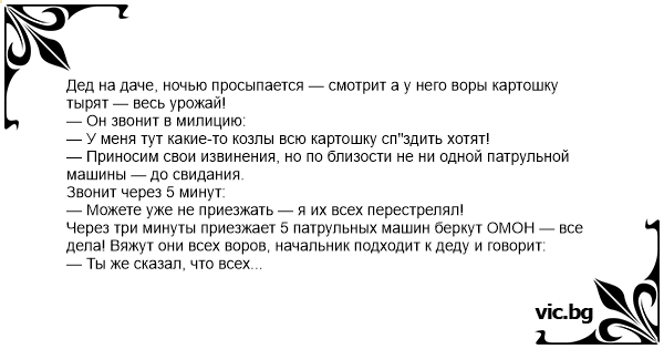 Через три минуты приезжает 5 патрульных машин беркут ОМОН — все дела! Вяжут они всех воров, начальник подходит к деду и говорит: