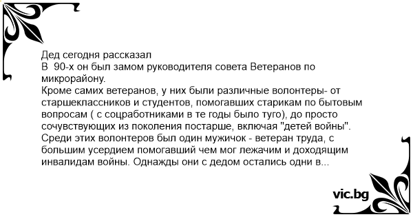 Кроме самих ветеранов, у них были различные волонтеры- от старшеклассников и студентов, помогавших старикам по бытовым вопросам ( с соцработниками в те годы было туго), до просто сочувствующих из поколения постарше, включая "детей войны". Среди этих волонтеров был один мужичок - ветеран труда, с большим усердием помогавший чем мог лежачим и доходящим инвалидам войны. Однажды они с дедом остались одни в здании совета Ветеранов. Пили чай, вспоминали жизнь. Дед рассказал про свою боевую карьеру в ВОВ. А мужичок, много лет работавший волонтером, улыбнулся и сказал: а я ведь тоже воевал...