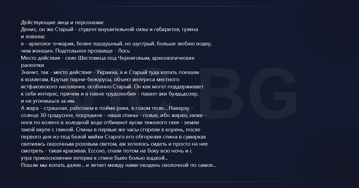 Действующие лица и персонажи: Денис, он же Старый - студент внушительной силы и габаритов, гулена и ловелас я - археолог-очкарик, более тщедушный, но шустрый, больше люблю водку, чем женщин. Подпольное прозвище - Лось Место действия - село Шестовица под Черниговым, археологические раскопки Значит, так - место действия - Украина, я и Старый туда копать поехали к коллегам. Крутые парни-белорусы, объект интереса местного истфаковского населения, особенно Старый. Он как могет поддерживает к себе интерес, причем и в плане трудолюбия - пахает аки булдьдозер, и не угонишься за им. А жара - страшная, работаем в пойме реки, в голом поле... Наверху - солнце 30-градусное, посредине - наши спины - голые, ибо жарко, ниже - ноги по колено в холодной воде отбивают куски тяжелого глея - земли такой вкупе с глиной. Спины в первые же часы сгорели в корень, после первого дня из-под белой майки Старого его обгорелая спина в сумерках светилась сказочным розовым светом, аж хотелось сидеть и просто на нее смотреть - такая красивая. Есссно, спали потом на боку всю ночь и с утра прикосновение ветерка к спине было болью аццкой... Пошли мы копать далее... и летает между нами оводень сволочной по самое не балуйся...... То меня укусит, то к Старому полетит.. И все норовит на спину сесть...... 20 мин эта cуka жужжит и не дает покою... а Старый копает за мной, я перед его мордой задницей мелькаю через 20 мин..... он устал летать и сел ко мне на спину поесть и отдохнуть....... мой друг ниччтоже сумняшеся изо всех своих сил, половины которых тогда хватило бы на то, чтобы проломать кирпичную стену, ВСЕЙ ПЯТЕРНЕЙ ХУЯРИТ - не бьет, а ХУЯРИТ меня по спине, впечатывая оводня мне в позвоночник. Я не говорю ни слова, подпрыгиваю от боли и с замогильным стоном падаю в холодную воду, и изливаю свою душу, булькая как бегемот в холодной родниковой воде. Потом начальник раскопа просил под запись ему продиктовать все то, что я сказала о сказал тогда о Старом. К вечеру, когда я уже мог сам ходить и интересовался миром так, чтобы вынашивать план мести - после двух бутылок водки и тостов о моем пошатнувшемся здоровье, короче, я вижу, что Денис усиленно флиртует с очаровательной девушкой, И НА СПИНУ ЕМУ САДИТСЯ КОМАР, его спина и моя ступня на одной горизонтали - комар не успел понять, что происходит и какая напасть с ним произошла...... но Старый изогнулся лебедем и спина его приобрела от дикой боли почти вид почти правильного полукруга. а потом он оборачивается ко мне и я вижу в его глазах слово СМЕРТЬ. Когда на третьем кругу он запыхался, и я мог не только бежать, но и что-то говорить, я ему напомнил утрешнего оводня.... тогда мы завершили бег возле того же стола, а потом работали две недели только в майках, и обращались в знак солидарности и уважения друг к другу на Вы так даже матом ругались - г-н Старый, перестаньте светить фонарем мне в е..ло, Г-н Лось - вы mудak.... вот такая история...