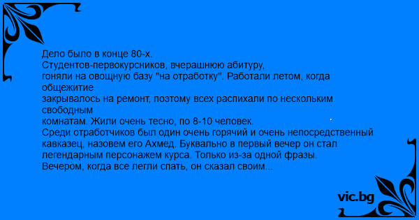 Дело было в конце 80-х. Студентов-первокурсников, вчерашнюю абитуру, гоняли на овощную базу "на отработку". Работали летом, когда общежитие закрывалось на ремонт, поэтому всех распихали по нескольким свободным комнатам. Жили очень тесно, по 8-10 человек. Среди отработчиков был один очень горячий и очень непосредственный кавказец, назовем его Ахмед. Буквально в первый вечер он стал легендарным персонажем курса. Только из-за одной фразы. Вечером, когда все легли спать, он сказал своим сокомнатникам: - Ви лажитес, спитэ, а я пайду сниму дэвачку. Чэрез час ви уснетэ, тут я с нэй и приду. Всо будэт тихо. Естественно, никто за этот час не уснул. Протравили анекдоты, ожидая, что же будет. Примерно через час дверь открывается. В дверном проеме появляются две тени и в замершей от ожидания комнате слышится голос Ахмеда: - Захады, нэ бойся, здэс всэго сэм чэловэк. Дикий хохот просто сотряс общагу. В тот вечер Ахмед оболомался на счет секса.