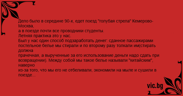 Дело было в середине 90-х, едет поезд "голубая стрела" Кемерово-Москва, а в поезде почти все проводники студенты.