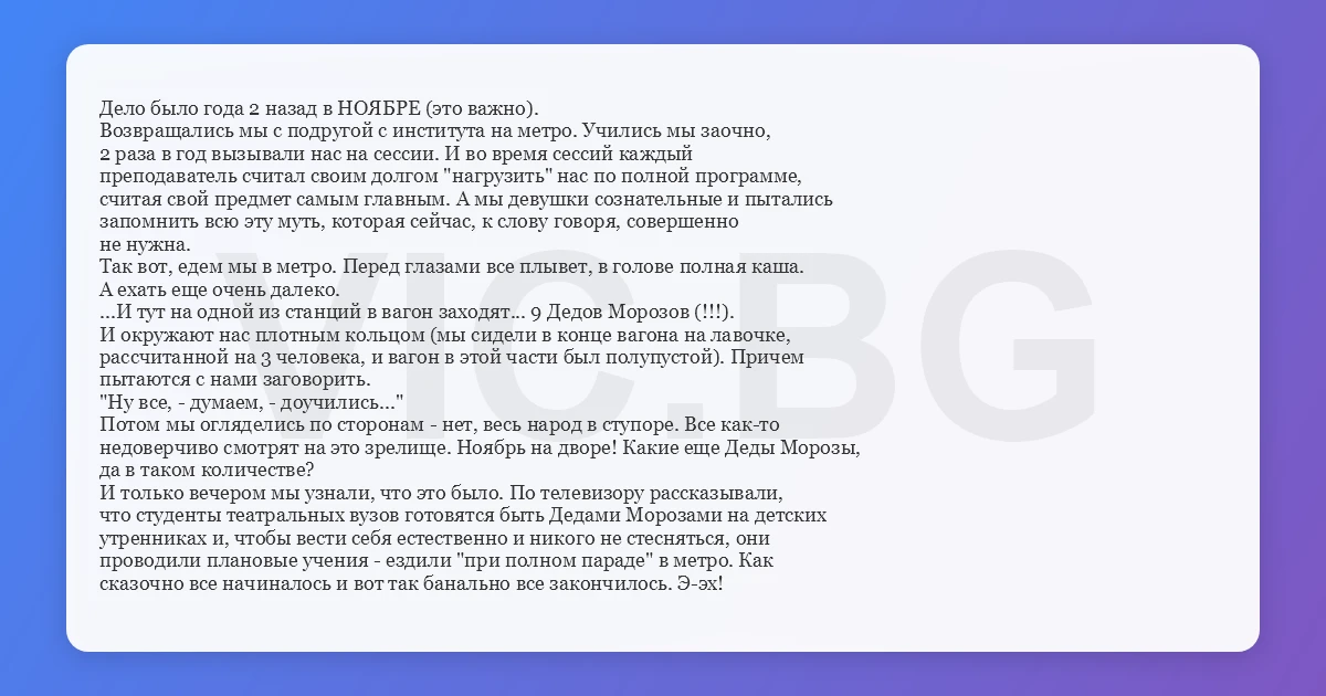 Дело было года 2 назад в НОЯБРЕ (это важно). Возвращались мы с подругой с института на метро. Учились мы заочно, 2 раза в год вызывали нас на сессии. И во время сессий каждый преподаватель считал своим долгом "нагрузить" нас по полной программе, считая свой предмет самым главным. А мы девушки сознательные и пытались запомнить всю эту муть, которая сейчас, к слову говоря, совершенно не нужна. Так вот, едем мы в метро. Перед глазами все плывет, в голове полная каша. А ехать еще очень далеко. ...И тут на одной из станций в вагон заходят... 9 Дедов Морозов (!!!). И окружают нас плотным кольцом (мы сидели в конце вагона на лавочке, рассчитанной на 3 человека, и вагон в этой части был полупустой). Причем пытаются с нами заговорить. "Ну все, - думаем, - доучились..." Потом мы огляделись по сторонам - нет, весь народ в ступоре. Все как-то недоверчиво смотрят на это зрелище. Ноябрь на дворе! Какие еще Деды Морозы, да в таком количестве? И только вечером мы узнали, что это было. По телевизору рассказывали, что студенты театральных вузов готовятся быть Дедами Морозами на детских утренниках и, чтобы вести себя естественно и никого не стесняться, они проводили плановые учения - ездили "при полном параде" в метро. Как сказочно все начиналось и вот так банально все закончилось. Э-эх!