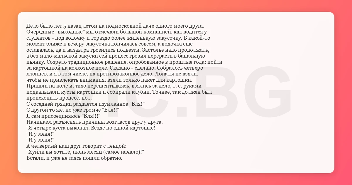 Дело было лет 5 назад летом на подмосковной даче одного моего друга. Очередные "выходные" мы отмечали большой компанией, как водится у студентов - под водочку и гораздо более жиденькую закусочку. В какой-то момент ближе к вечеру закусочка кончилась совсем, а водочка еще оставалась, да и назавтра грозились подвезти. Застолье надо продолжать, а без мало-мальской закуски сей процесс грозил перерасти в банальную пьянку. Созрело традиционное решение, опробованное в прошлые года: пойти за картошкой на колхозное поле. Сказано - сделано. Собралось четверо хлопцев, и я в том числе, на противозаконное дело. Лопаты не взяли, чтобы не привлекать внимания, взяли только пакет для картошки. Пришли на поле и, тихо перешептываясь, взялись за дело, т. е. руками подкапывали кусты картошки и собирали клубни. Точнее, так должен был происходить процесс, но... С соседней грядки раздается изумленное "Бля!" С другой то же, но уже громче "Бля!!" Я сам присоединяюсь "Бля!!!" Начинаем разъяснять причины возгласов друг у друга. "Я четыре куста выкопал. Везде по одной картошке!" "И у меня!" "И у меня!" А четвертый наш друг говорит с ленцой: "Хуйли вы хотите, июнь месяц (самое начало)!" Встали, и уже не таясь пошли обратно.