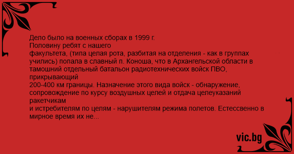 Дело было на военных сборах в 1999 г. Половину ребят с нашего факультета, (типа целая рота, разбитая на отделения - как в группах учились) попала в славный п. Коноша, что в Архангельской области в тамошний отдельный батальон радиотехнических войск ПВО, прикрывающий 200-400 км границы. Назначение этого вида войск - обнаружение, сопровождение по курсу воздушных целей и отдача целеуказаний ракетчикам и истребителям по целям - нарушителям режима полетов. Естессвенно в мирное время их не сбивают, но сопровождают даже рейсовые самолеты, а вдруг что. Подполковник - начальник части решил помимо тяжелого физического труда на благо части (колючку на заборах пертянуть, крышу казармы перетянуть)решил все-таки показать боевую технику - различные РЛС и высотомеры в работе. Отделениями по 6-8 человек мы забивались в тесные вагончики-прицепы с аппаратурой и смотрели как работают солдаты операторы под присмотром офицера, а потом и сами пробовали. Конечно, когда садились за ИКО (индикаторы кругового обзора)студенты, то аппаратура передачи целеуказания и характеристик цели (это задавалось оператором - т. е вид цели - военная или гражданская, ее потенциальную опасноть и. т. д) блокировалась офицером. Но лейтеха тоже ведь не железный, на патой (нашей) группе сломался - вышел покурить, строго - настрого приказал ничего без него не трогать, кроме того что он уже успел показать. Зря от так сделал, ибо как включать - отключать блокировку он уже показал. А так как в то время некопмлект офицеров и солдат в части был дикий (вместо 80 солдат и 50 прапоров и офиеров - 8 и 30 соответсвенно) на командном пункте, где отсматривают передаваемые сигналы от операторов и решают что передавать выше - в в полк и авиации сидел молодой солдатик, который боялся во что либо вмешиваться и аппаратура передачи работала на автомате. Наши раздолбаи тут же начали крутить все что увидели, случайно :) выключили блокировку сигналов передачи от оператора, а другие не видя этого честно продолжали отслеживать полет целей, "скалывая" их координаты, назначая характеристики (влоть до вражеских крылатых ракет). Через 5 минут лейтеха возвращается и не проверив блокировку продолжает нас учить, показывать как передавать данные зенитчикам-ракетчикам в истребительную авиацию ПВО. А еще через 15 минут через внутренную рацию раздается дикий мат подполковника, котрый поведал все что он думает про несчастного лейтеху и его - долбо..ов студентов, которые отослали целеуказания на шведский авиалайнер как на вражеский военный самолет аж в штаб полка, и откуда его по телефоне уже успел вы..ть дежурный полковник и скоро вые..т цельный генерал. мат продолдался минуты 2. лейтеха дрожащим голосом скомандовал всем вернуться в часть. История кончилась в принипе благополучно - лайнер сбивать не стали, лейтеха своего старлея получил на полгода позже, а мы оставшийся месяц тяжким трудом смывали свое "преступление". Небольшой PS. Очень часто в разговорах, книжках читал (слышал) что пистолет Макарова - дepьmo страшное, из которого можно только застрелиться а попасть в цель - нерально. Так вот, на стрельбах перед принятием присяги из 60 студентов - ботанов с 25 метров по поясной мишени всеми тремя выстрелами не попали только 2 суперботана, но они и ложкой мимо рта могли промахнуться. Так что русское оружие - FOREVER!