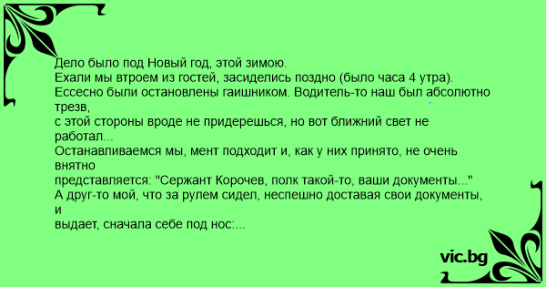 Дело было под Новый год, этой зимою. Ехали мы втроем из гостей, засиделись поздно (было часа 4 утра). Ессесно были остановлены гаишником. Водитель-то наш был абсолютно трезв, с этой стороны вроде не придерешься, но вот ближний свет не работал... Останавливаемся мы, мент подходит и, как у них принято, не очень внятно представляется: "Сержант Корочев, полк такой-то, ваши документы..." А друг-то мой, что за рулем сидел, неспешно доставая свои документы, и выдает, сначала себе под нос: "Хэ, короче...", потом оторопевшему менту: "Да куда уж короче!... Представляться вообще-то надо!" (Это потом он нам объяснил, что ему послышалось что-то вроде "короче, ваши документы" и он решил качнуть права, а тогда мы вдвоем просто о*уели). А гаишник-то ваще обалдел, у него аж руки опустились. Он забормотал как-то обиженно: "Так я и представился... сержант Корочев... полк такой-то... ваши документы..." Водила наш глянул на него сурово, пробормотал что-то вроде "Ну хpeн с тобой, короче так короче..." (опять не услышал!) Потом гаишник как-то робко попытался пожурить его за фары, выслушал в ответ "ну надо же, только 10 минут назад проверял, все работало" ... и отпустил нас, даже денег не взял! Когда мы все втроем наконец поняли, что произошло, то ржали как припадочные. Вот ведь захочешь, а специально так не сделаешь. ЗЫ Встретишь сержанта Корочева, не обижай его - он мой. ;)