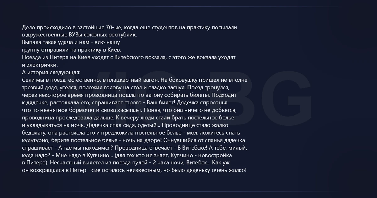 Дело происходило в застойные 70-ые, когда еще студентов на практику посылали в дружественные ВУЗы союзных республик. Выпала такая удача и нам - всю нашу группу отправили на практику в Киев. Поезда из Питера на Киев уходят с Витебского вокзала, с этого же вокзала уходят и электрички. А история следующая: Сели мы в поезд, естественно, в плацкартный вагон. На боковушку пришел не вполне трезвый дядя, уселся, положил голову на стол и сладко заснул. Поезд тронулся, через некоторое время проводница пошла по вагону собирать билеты. Подходит к дядечке, растолкала его, спрашивает строго - Ваш билет! Дядечка спросонья что-то невнятное бормочет и снова засыпает. Поняв, что она ничего не добьется, проводница проследовала дальше. К вечеру люди стали брать постельное белье и укладываться на ночь. Дядечка спал сидя, одетый... Проводнице стало жалко бедолагу, она растрясла его и предложила постельное белье - мол, ложитесь спать культурно, берите постельное белье - ночь на дворе! Очнувшийся от спанья дядечка спрашивает - А где мы находимся? Проводница отвечает - В Витебске! А тебе, милый, куда надо? - Мне надо в Купчино... (для тех кто не знает, Купчино - новостройка в Питере). Несчастный вылетел из поезда пулей - 2 часа ночи, Витебск... Как уж он возвращался в Питер - сие осталось неизвестным, но было дяденьку очень жалко!
