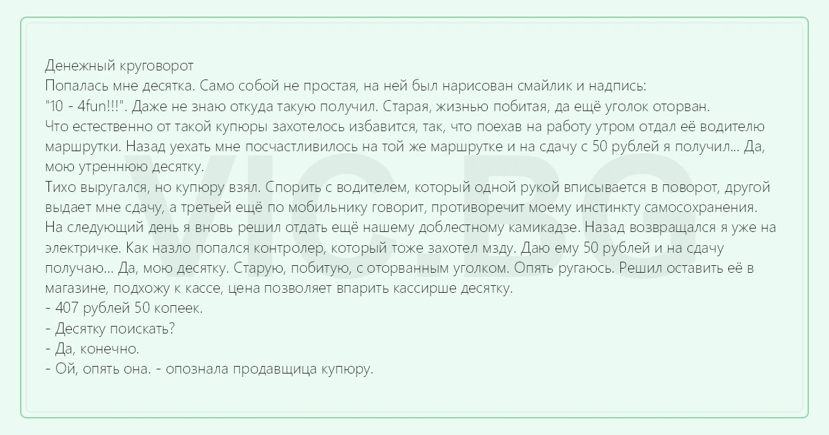 На следующий день я вновь решил отдать ещё нашему доблестному камикадзе. Назад возвращался я уже на электричке. Как назло попался контролер, который тоже захотел мзду. Даю ему 50 рублей и на сдачу получаю... Да, мою десятку. Старую, побитую, с оторванным уголком. Опять ругаюсь. Решил оставить её в магазине, подхожу к кассе, цена позволяет впарить кассирше десятку.