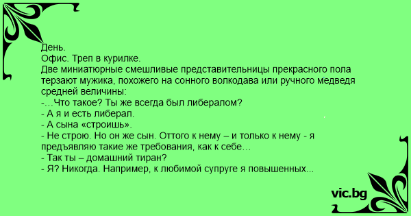 День. Офис. Треп в курилке. Две миниатюрные смешливые представительницы прекрасного пола терзают мужика, похожего на сонного волкодава или ручного медведя средней величины: -…Что такое? Ты же всегда был либералом? - А я и есть либерал. - А сына «строишь». - Не строю. Но он же сын. Оттого к нему – и только к нему - я предъявляю такие же требования, как к себе… - Так ты – домашний тиран? - Я? Никогда. Например, к любимой супруге я повышенных требований не предъявляю… - Чё вдруг? - Потому что женщины - нежные слабые создания. - Да ну да! Просто от жены можно и выхватить. По хребту огрести. - Я же и говорю – они нежные слабые создания… - А чего бы честно не признаться, что на жену наезжать сыкотно? - Конечно, сыкотно. Но как я могу в таком признаться? - А что мешает? - Как что? Я же мужчина. Я сильный и смелый. - А жены боишься? - Естественно. Она же - слабое и нежное создание…