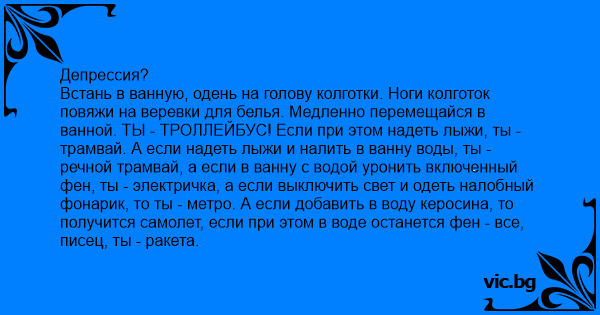 Депрессия? Встань в ванную, одень на голову колготки. Ноги колготок повяжи на веревки для белья. Медленно перемещайся в ванной. ТЫ - ТРОЛЛЕЙБУС! Если при этом надеть лыжи, ты - трамвай. А если надеть лыжи и налить в ванну воды, ты - речной трамвай, а если в ванну с водой уронить включенный фен, ты - электричка, а если выключить свет и одеть налобный фонарик, то ты - метро. А если добавить в воду керосина, то получится самолет, если при этом в воде останется фен - все, пиcец, ты - ракета.