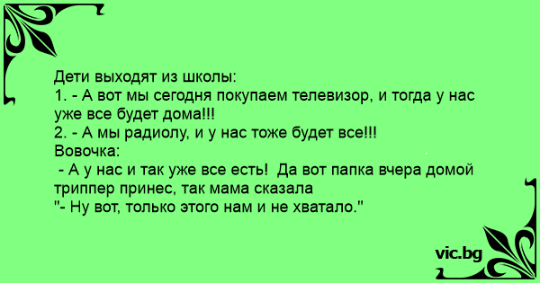 - А у нас и так уже все есть! Да вот папка вчера домой триппер принес, так мама сказала