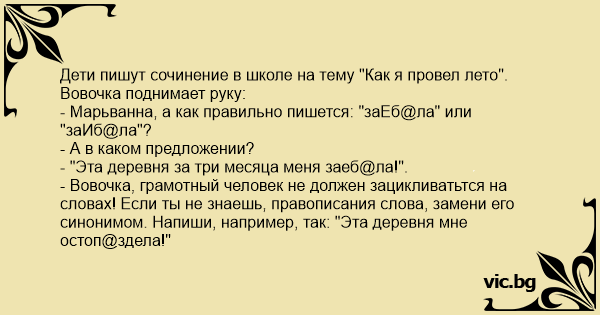 Дети пишут сочинение в школе на тему "Как я провел лето". Вовочка поднимает руку: