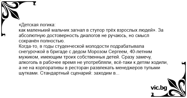 Когда-то, в годы студенческой молодости подрабатывала снегурочкой в бригаде с дедом Морозом Сергеем, 40-летним мужиком, имеющим троих собственных детей. Сразу замечу, алкоголь в рабочее время не употребляли, всё-таки к детям ходили, а не на корпоративы в ресторан развлекать менеджеров тупыми шутками. Стандартный сценарий: заходим в квартиру, с порога небольшой спектакль на тему поздравления дитя с новым годом и расхваливанием красиво наряженной ёлки. Далее Сергей: «я добрый дедушка мороз, я подарок принёс». Затем я (снегурка): «отгадаешь мою загадку – дедушка тебе подарок отдаст: зимой и летом – одним цветом, что это такое?». Ребёнок, как правило, сразу отвечает, что это ёлка, и получает «заслуженный» подарок. Были пару случаев, когда малыш задумывался, тогда ему давали подсказки и добивались правильного ответа. В этот раз перед нами беловолосый трёхлетний ангелочек. Классическая загадка, ожидаем ответ «ёлочка», после чего дед Мороз должен похвалить умницу и вручить подарок. И тут случился, как говорят психологи, «разрыв шаблона». Мальчик, не раздумывая, с неподдельной радостью выпалил: «я знаю, знаю, это луна!» Молчаливая пауза стояла секунд десять-пятнадцать. Зависли все, включая папу ребёнка. А виновник случившегося с недоумением на лице ждал, пока дед Мороз откроет мешок. Сергей: «Какая ещё луна?!» К счастью сдержался и не добавил «бля» или «нах…», как он привык выражаться в подобных ситуациях. Ребёнок: «ну луна, которая висит на небе, она зимой и летом одним цветом, это же правда. Я хочу паровозики». Дед Мороз зависает ещё на дюжину секунд. После чего восклицает: «слушайте, а ведь правильно! Луна зимой и летом одним цветом! Молодец! Вот держи, открывай, железная дорога, такая как ты просил у дедушки мороза». Расстались на позитивной ноте.