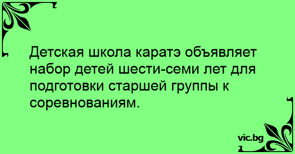 Детская школа каратэ объявляет набор детей шести-семи лет для подготовки старшей группы к соревнованиям.