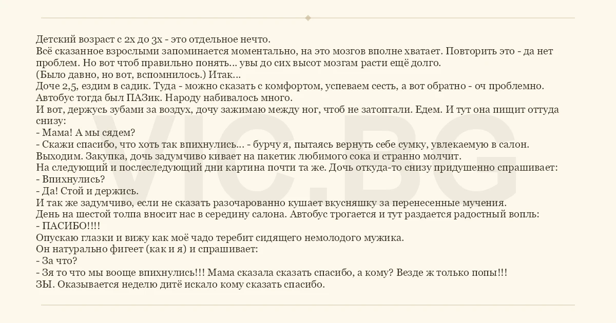 Детский возраст с 2х до 3х - это отдельное нечто. Всё сказанное взрослыми запоминается моментально, на это мозгов вполне хватает. Повторить это - да нет проблем. Но вот чтоб правильно понять... увы до сих высот мозгам расти ещё долго. (Было давно, но вот, вспомнилось.) Итак... Доче 2,5, ездим в садик. Туда - можно сказать с комфортом, успеваем сесть, а вот обратно - оч проблемно. Автобус тогда был ПАЗик. Народу набивалось много. И вот, держусь зубами за воздух, дочу зажимаю между ног, чтоб не затоптали. Едем. И тут она пищит оттуда снизу: - Мама! А мы сядем? - Скажи спасибо, что хоть так впихнулись... - бурчу я, пытаясь вернуть себе сумку, увлекаемую в салон. Выходим. Закупка, дочь задумчиво кивает на пакетик любимого сока и странно молчит. На следующий и послеследующий дни картина почти та же. Дочь откуда-то снизу придушенно спрашивает: - Впихнулись? - Да! Стой и держись. И так же задумчиво, если не сказать разочарованно кушает вкусняшку за перенесенные мучения. День на шестой толпа вносит нас в середину салона. Автобус трогается и тут раздается радостный вопль: - ПАСИБО!!!! Опускаю глазки и вижу как моё чадо теребит сидящего немолодого мужика. Он натурально фигеет (как и я) и спрашивает: - За что? - Зя то что мы вооще впихнулись!!! Мама сказала сказать спасибо, а кому? Везде ж только попы!!! ЗЫ. Оказывается неделю дитё искало кому сказать спасибо.