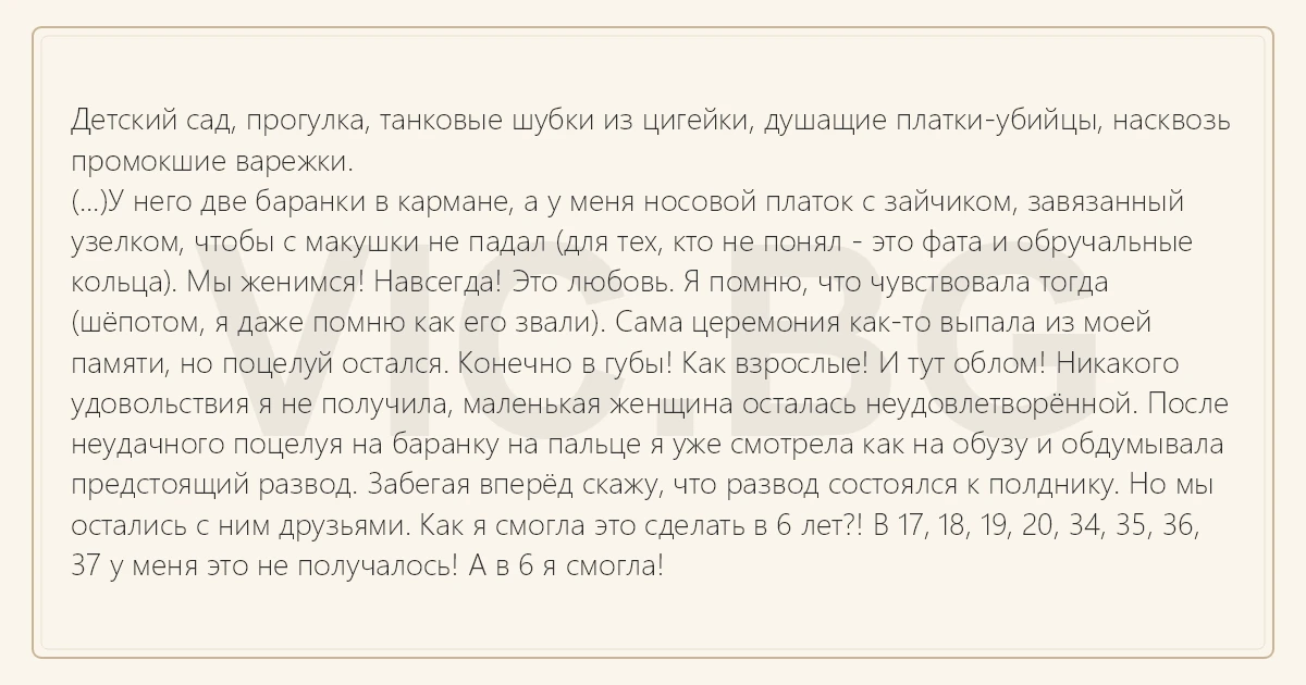 Детский сад, прогулка, танковые шубки из цигейки, душащие платки-убийцы, насквозь промокшие варежки. (...)У него две баранки в кармане, а у меня носовой платок с зайчиком, завязанный узелком, чтобы с макушки не падал (для тех, кто не понял - это фата и обручальные кольца). Мы женимся! Навсегда! Это любовь. Я помню, что чувствовала тогда (шёпотом, я даже помню как его звали). Сама церемония как-то выпала из моей памяти, но поцелуй остался. Конечно в губы! Как взрослые! И тут облом! Никакого удовольствия я не получила, маленькая женщина осталась неудовлетворённой. После неудачного поцелуя на баранку на пальце я уже смотрела как на обузу и обдумывала предстоящий развод. Забегая вперёд скажу, что развод состоялся к полднику. Но мы остались с ним друзьями. Как я смогла это сделать в 6 лет?! В 17, 18, 19, 20, 34, 35, 36, 37 у меня это не получалось! А в 6 я смогла!
