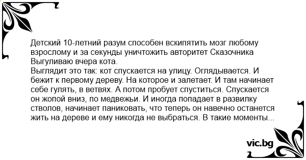 Детский 10-летний разум способен вскипятить мозг любому взрослому и за секунды уничтожить авторитет Сказочника Выгуливаю вчера кота. Выглядит это так: кот спускается на улицу. Оглядывается. И бежит к первому дереву. На которое и залетает. И там начинает себе гулять, в ветвях. А потом пробует спуститься. Спускается он жопой вниз, по медвежьи. И иногда попадает в развилку стволов, начинает паниковать, что теперь он навечно останется жить на дереве и ему никогда не выбраться. В такие моменты мне приходится его подбадривать снизу. Да, ты спустишься, я в тебя верю, твоя задница не настолько здоровая, чтобы тебя заклинило, давай давай, ещё чуть чуть Собственно, за этим занятием меня вчера и застукала проходящая мимо пара: мама и деть. Точнее, они бы шли себе мимо и дальше, если бы деть не остановился и не спросил маму: - А почему дядя с деревом разговаривает? Мама остановилась, и подозрительно посмотрела на меня. - Кот! У меня там Кот! - я поспешил оправдаться. И тут деть выдает: - А я понял, почему у Пушкина кот на цепи сидел! Чтобы он на дерево не залез, правильно? Правильно!- обрадовалась мама, и гордо посмотрела на меня. И тут черт меня дернул поддержать её. Молчал бы себе в тряпочку, всем бы лучше было. Но нет же. Ага - говорю, - верно! Коту нельзя на дерево: там же русалка сидит. В ветвях. - Ой! А что она там делает? Хороший вопрос, черт возьми. Хотел бы я и сам знать. Она же русалка, а не вобла, чтобы сушиться на солнышке. Мама выжидающе посмотрела на меня. С надеждой. - Ну там же Леший бродит - я не нашел ничего лучшего. - Она от него и прячется. В ветвях. - А почему она от Лешего прячется?- деть не унимался. Мама с ненавистью посмотрела на меня. Нууу.. ( блин, это уже не детский разговор совершенно: почему русалка от Лешего спряталась) И тут мама рывком дергает ребенка: - Почему-почему, да потому, что она сумасшедшая! Там все сумасшедшие. И кот, и русалка! - Она дернула его за руку, и они пошли. - И Пушкин тоже? - донеслось до меня уже издалека. Я зажмурился.