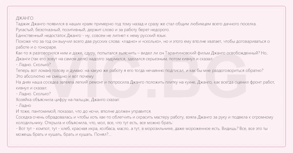 Как-то я разговорился ним и даже, сдуру, попытался выяснить – видел ли он Тарантиновский фильм Джанго освобожденный? Но, Джанги (так его зовут на самом деле) надолго задумался, зделался серьезным, потом кивнул и сказал: