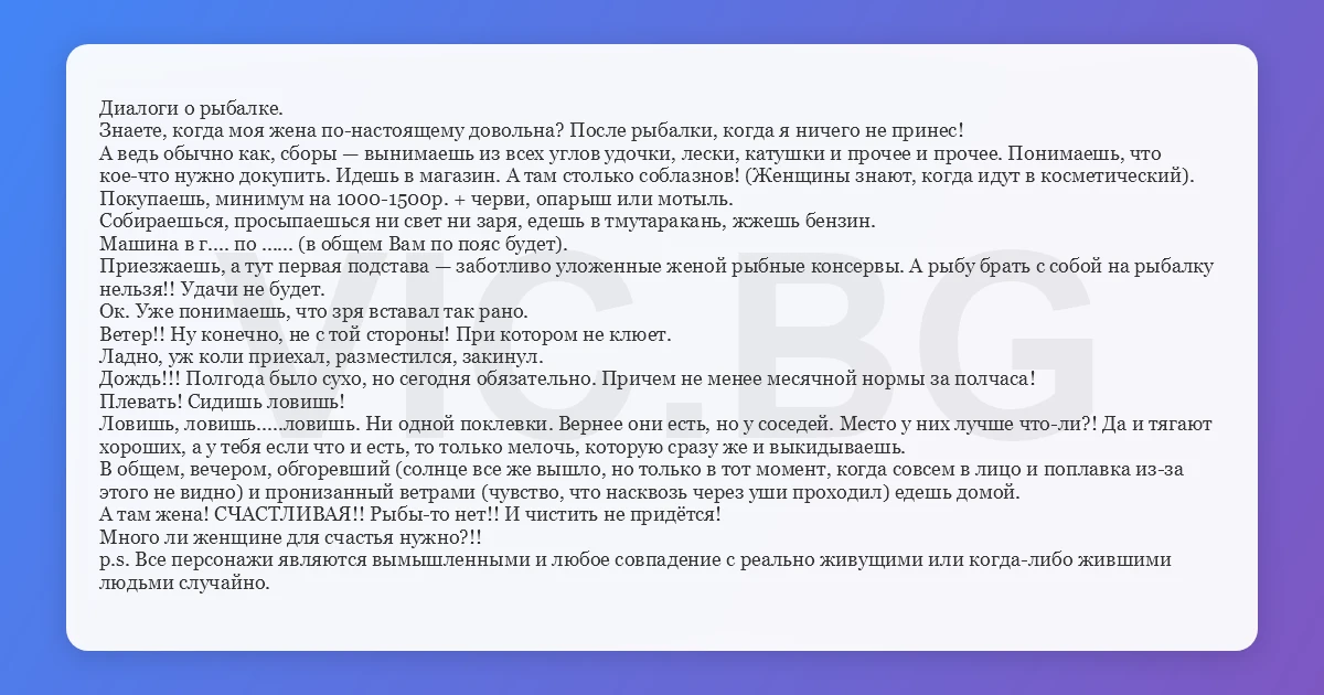 Диалоги о рыбалке. Знаете, когда моя жена по-настоящему довольна? После рыбалки, когда я ничего не принес! А ведь обычно как, сборы — вынимаешь из всех углов удочки, лески, катушки и прочее и прочее. Понимаешь, что кое-что нужно докупить. Идешь в магазин. А там столько соблазнов! (Женщины знают, когда идут в косметический). Покупаешь, минимум на 1000-1500р. + черви, опарыш или мотыль. Собираешься, просыпаешься ни свет ни заря, едешь в тмутаракань, жжешь бензин. Машина в г.... по ...... (в общем Вам по пояс будет). Приезжаешь, а тут первая подстава — заботливо уложенные женой рыбные консервы. А рыбу брать с собой на рыбалку нельзя!! Удачи не будет. Ок. Уже понимаешь, что зря вставал так рано. Ветер!! Ну конечно, не с той стороны! При котором не клюет. Ладно, уж коли приехал, разместился, закинул. Дождь!!! Полгода было сухо, но сегодня обязательно. Причем не менее месячной нормы за полчаса! Плевать! Сидишь ловишь! Ловишь, ловишь.....ловишь. Ни одной поклевки. Вернее они есть, но у соседей. Место у них лучше что-ли?! Да и тягают хороших, а у тебя если что и есть, то только мелочь, которую сразу же и выкидываешь. В общем, вечером, обгоревший (солнце все же вышло, но только в тот момент, когда совсем в лицо и поплавка из-за этого не видно) и пронизанный ветрами (чувство, что насквозь через уши проходил) едешь домой. А там жена! СЧАСТЛИВАЯ!! Рыбы-то нет!! И чистить не придётся! Много ли женщине для счастья нужно?!! p.s. Все персонажи являются вымышленными и любое совпадение с реально живущими или когда-либо жившими людьми случайно.