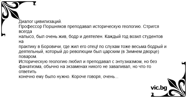 Диалог цивилизаций. Профессор Поршняков преподавал историческую геологию. Стригся всегда налысо, был очень жив, бодр и деятелен. Каждый год возил студентов на практику в Боровичи, где жил его отец! по слухам тоже весьма бодрый и деятельный, который до революции был царским (в Зимнем дворце) поваром. Историческую геологию любил и преподавал с энтузиазмом, но без фанатизма, обычно на экзаменах никого не заваливал, но что-то ответить конечно ему было нужно. Короче говоря, очень симпатичный старикан. Армия геологов в СССР составляла 2 млн. человек, выпускники геологического факультета ЛГУ были весьма востребованы и студенты в общем-то были подготовлены неплохо, большинство выбор профессии делали сознательно. Но, на коне несется тройка - Мишка, Райка, перестройка, а через несколько лет и Гайдар с реформами. В самом начале 90-х престиж высшего образования упал ниже канализации, а уж престиж геологии... и говорить нечего. И народ на факультете стал учиться какой-то никакой и непонятный. Непохожий на все, что было все предыдущие годы. Что привело их в эти стены вряд ли бы они смогли объяснить. Новое, блин, поколение. Но профессора Поршнякова это не смущало и он все так же увлеченно преподавал историческую геологию, так же как и десятки предшествующих лет. И учился у него некий азербайджанец, молодой коммерсант, владелец ларька. По-русски говорил так себе, а уж науки какие-либо постичь был просто не в состоянии. Но как-то и зачем-то учился. Сдает он историческую геологию, а она не сдается. Не знает ни хpeнa. Честно говоря он даже и не знал, что Волга впадает в Каспийское море, да и что такое Волга тоже думаю не знал. Но экзамены сдавать умел. В этот раз он решил дать взятку кожаной курткой. И промычав что-то бессвязное на тему исторической геологии, взял быка за рога. Тиби куртка нужен? Харочий, кожаный, да. - Какая еще куртка? - Джелтый, польский. - Я вас не понимаю, отвечайте на вопрос. И так полчаса. В конце концов он поставил ему двойку, но так и не понял, что ему предлагали взятку! Потом ходил и ругался, что сумасшедших набрали. Через несколько лет умер, искренне считая, что ни разу в жизни не столкнулся со взяткой. Что там Редьярд Киплинг говорил про Восток и Запад?