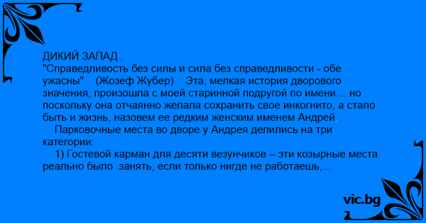 "Справедливость без силы и сила без справедливости - обе ужасны" (Жозеф Жубер) Эта, мелкая история дворового значения, произошла с моей старинной подругой по имени… но поскольку она отчаянно желала сохранить свое инкогнито, а стало быть и жизнь, назовем ее редким женским именем Андрей.