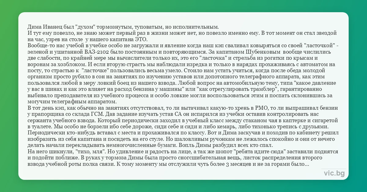 Вообще-то нас учебой в учебке особо не загружали и явление когда наш кэп сваливал ковыряться со своей "ласточкой" - зеленой и ушатанной ВАЗ-2102 было постоянным и повторяющимся. За капитаном Шубенковым вообще числились две слабости, по крайней мере мы вычислители только их, это его "ласточка" и стрельба из рогатки по крысам и воронам за хозблоком. И если вторую страсть мы наблюдали изредка и только в нарядах прохаживаясь с автоматом на посту, то страстью к "ласточке" пользовались весьма умело. Стоило нам устать учиться, когда после обеда молодой организм просто рубило в сон на занятиях по изучению уставов или допотопного телеграфного аппарата, как этим пользовался любой в меру ловкий боец из нашего взвода. Любой вопрос на автомобильную тему, типа "какое давление у вас в шинах и как это влияет на расход бензина у машины" или "как отрегулировать трамблер", гарантированно выбивало преподавателя из учебного процесса и особо ловкие могли воспользоваться этим и поспать склонившись за могучим телеграфным аппаратом.