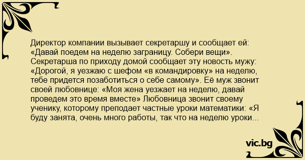 Секретарша по приходу домой сообщает эту новость мужу: «Дорогой, я уезжаю с шефом «в командировку» на неделю, тебе придется позаботиться о себе самому». Её муж звонит своей любовнице: «Моя жена уезжает на неделю, давай проведем это время вместе» Любовница звонит своему ученику, которому преподает частные уроки математики: «Я буду занята, очень много работы, так что на неделю уроки отменяются».. Довольный мальчик звонит своему дедушке: «Дедуль, у меня всю неделю не будет занятий, т..к. учительница будет занята. Давай проведем всю неделю вместе». Дедушка (директор компании) снова звонит своей секретарше: «На этой неделе внук просит провести с ним время. Поездка отменяется. Поедем позже» Секретарша звонит своему мужу и говорит: «Шеф занят на этой неделе, мы отложили командировку» Муж звонит любовнице: «Не получится на этой неделе встретиться, жена отменила поездку» Любовница звонит ученику: «Занятия на этой неделе будут как обычно» Ученик звонит дедушке: «Дедуль, учительница говорит, что на этой неделе уроки будут как обычно. Я не смогу составить тебе компанию» Дедушка звонит своей секретарше: «Не беспокойся, мы поедем на этой неделе. Собирай вещи»