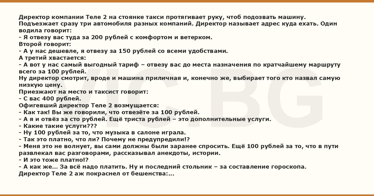 Директор компании Теле 2 на стоянке такси протягивает руку, чтоб подозвать машину. Подъезжает сразу три автомобиля разных компаний. Директор называет адрес куда ехать. Один водила говорит: - Я отвезу вас туда за 200 рублей с комфортом и ветерком. Второй говорит: - А у нас дешевле, я отвезу за 150 рублей со всеми удобствами. А третий хвастается: - А вот у нас самый выгодный тариф – отвезу вас до места назначения по кратчайшему маршруту всего за 100 рублей. Ну директор смотрит, вроде и машина приличная и, конечно же, выбирает того кто назвал самую низкую цену. Приезжают на место и таксист говорит: - С вас 400 рублей. Офигевший директор Теле 2 возмущается: - Как так! Вы же говорили, что отвезёте за 100 рублей. - А я и отвёз за сто рублей. Ещё триста рублей – это дополнительные услуги. - Какие такие услуги??? - Ну 100 рублей за то, что музыка в салоне играла. - Так это платно, что ли? Почему не предупредили!? - Меня это не волнует, вы сами должны были заранее спросить. Ещё 100 рублей за то, что в пути развлекал вас разговорами, рассказывал анекдоты, истории. - И это тоже платно!? - А как же… За всё надо платить. Ну и последний стольник – за составление гороскопа. Директор Теле 2 аж покраснел от бешенства: - Какого гороскопа!!!??? Водила: - Ну ты, КОЗЕРОГ,– гони бабки, а то будут проблемы!