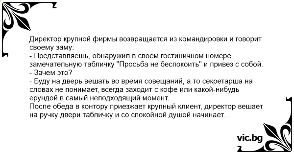 После обеда в контору приезжает крупный клиент, директор вешает на ручку двери табличку и со спокойной душой начинает переговоры. Через 5 минут в кабинет входит секретарша с веником и, не обращая внимания на бизнесменов, начинает подметать вокруг них. Офигевший директор: