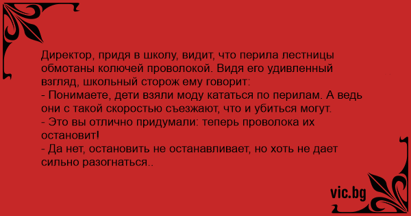 Директор, придя в школу, видит, что перила лестницы обмотаны колючей проволокой. Видя его удивленный взгляд, школьный сторож ему говорит: