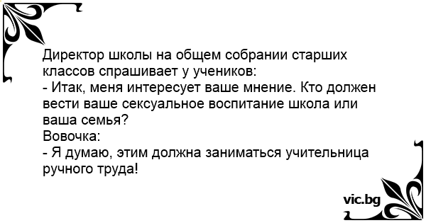 - Итак, меня интересует ваше мнение. Кто должен вести ваше сексуальное воспитание школа или ваша семья?
