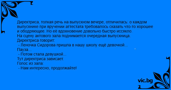 Директриса, толкая речь на выпускном вечере, отличилась: о каждом выпускнике при вручении аттестата требовалось сказать что-то хорошее и ободряющее. Но её вдохновение довольно быстро иссякло.