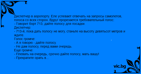 Диспетчер в аэропорту. Еле успевает отвечать на запросы самолетов, голоса со всех сторон. Вдруг прорезается требовательный голос: - Говорит борт 713, дайте полосу для посадки. Диспетчер: - 713-й, пока дать полосу не могу, станьте на высоту девятьсот метров и ждите. Голос громче: - А я говорю - дайте полосу. - Не дам полосу, перед вами очередь. Еще громче: - Плевать на очередь, срочно дайте полосу, мать вашу! - Прекратите орать в микрофон! - КАКОЙ НА ХPEH МИКРОФОН, ОН У МЕНЯ УЖ ПОЛЧАСА КАК ОТКАЗАЛ!