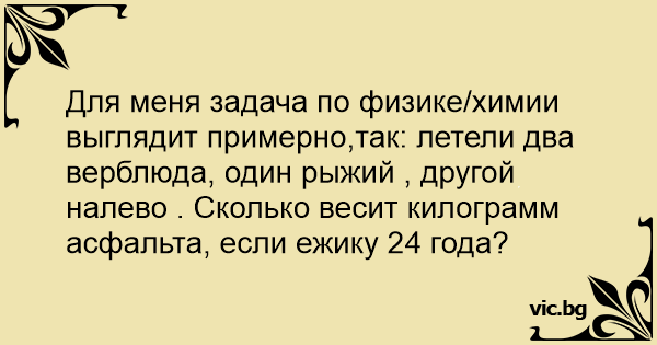 Для меня задача по физике/химии выглядит примерно,так: летели два верблюда, один рыжий , другой налево . Сколько весит килограмм асфальта, если ежику 24 года?