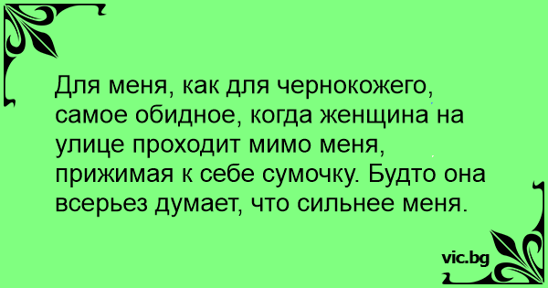 Для меня, как для чернокожего, самое обидное, когда женщина на улице проходит мимо меня, прижимая к себе сумочку. Будто она всерьез думает, что сильнее меня.