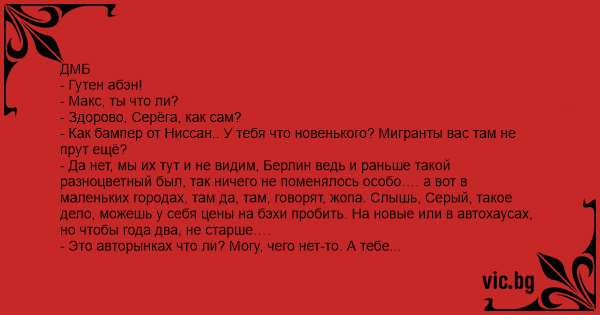 - Да нет, мы их тут и не видим, Берлин ведь и раньше такой разноцветный был, так ничего не поменялось особо…. а вот в маленьких городах, там да, там, говорят, жoпa. Слышь, Серый, такое дело, можешь у себя цены на бэхи пробить. На новые или в автохаусах, но чтобы года два, не старше….