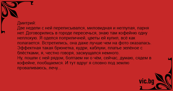 Две недели с ней переписывался, миловидная и неглупая, парня нет. Договорились в городе пересечься, знаю там кофейню одну неплохую. Я оделся поприличней, цветы ей купил, всё как полагается. Встретились, она даже лучше чем на фото оказалась. Эффектная такая брюнетка, кудри, каблуки, платье зелёное с блёстками, я, честно говоря, засмущался немного.