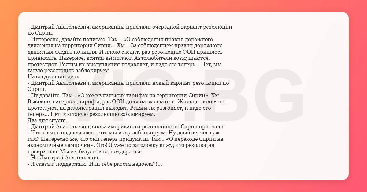 - Дмитрий Анатольевич, американцы прислали очередной вариант резолюции по Сирии. - Интересно, давайте почитаю. Так... «О соблюдении правил дорожного движения на территории Сирии». Хм... За соблюдением правил дорожного движения следит полиция. И плохо следит, раз резолюцию ООН пришлось принимать. Наверное, взятки вымогают. Автолюбители возмущаются, протестуют. Режим их выступления подавляет, и надо его теперь... Нет, мы такую резолюцию заблокируем. На следующий день. - Дмитрий Анатольевич, американцы прислали новый вариант резолюции по Сирии. - Ну давайте. Так... «О коммунальных тарифах на территории Сирии». Хм... Высокие, наверное, тарифы, раз ООН должна вмешаться. Жильцы, конечно, протестуют, на демонстрации выходят. Режим их разгоняет, и надо его теперь... Нет, мы такую резолюцию заблокируем. Два дня спустя. - Дмитрий Анатольевич, снова американцы резолюцию по Сирии прислали. - Что-то мне подсказывает, что мы и эту заблокируем. Ну давайте, чего уж там? Интересно же, что они теперь придумали. Так... «О переходе Сирии на экономичные лампочки». Ого! Я уже по заголовку вижу, что резолюция прекрасная. Мы ее, безусловно, поддержим. - Но Дмитрий Анатольевич... - Я сказал: поддержим! Или тебе работа надоела?! На следующий день. - Дмитрий Анатольевич, американцы Сирию бомбят! - Хм... А, это они, наверное, старые лампочки утилизируют.