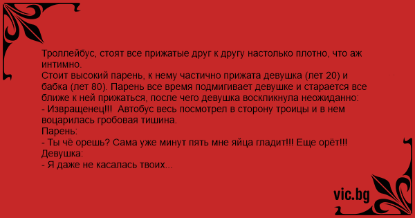 Стоит высокий парень, к нему частично прижата девушка (лет 20) и бабка (лет 80). Парень все время подмигивает девушке и старается все ближе к ней прижаться, после чего девушка воскликнула неожиданно: