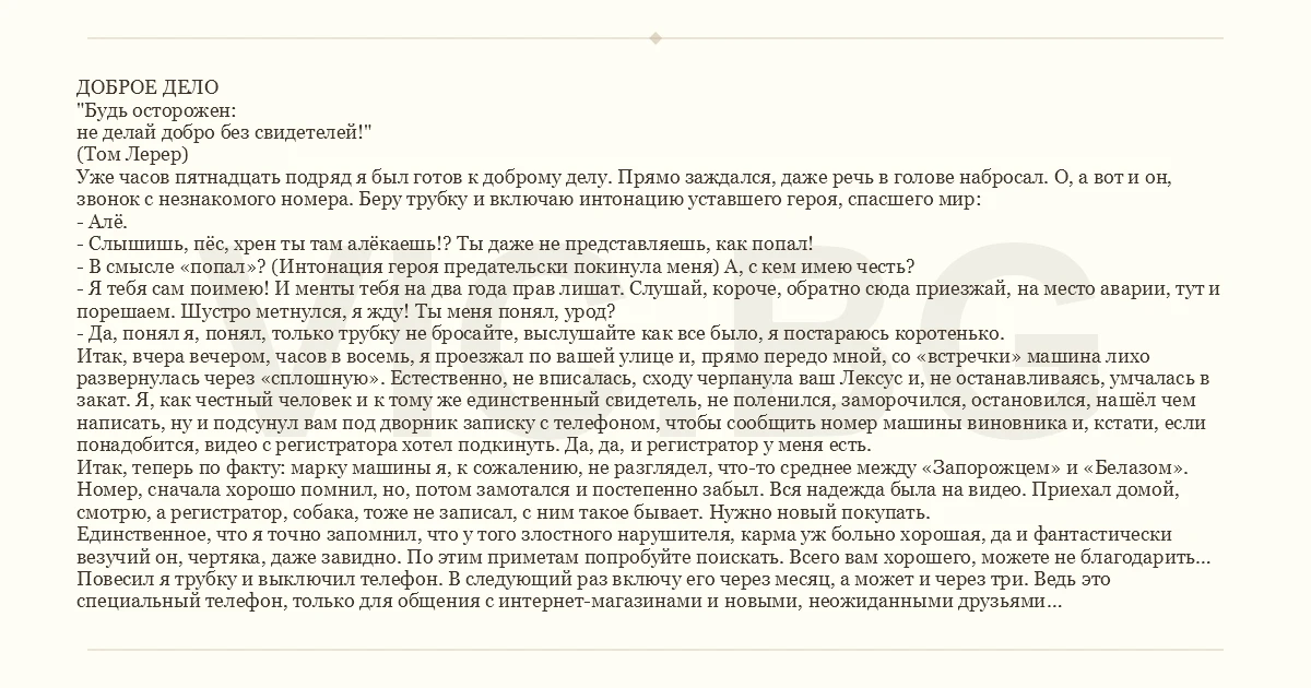 ДОБРОЕ ДЕЛО "Будь осторожен: не делай добро без свидетелей!" (Том Лерер) Уже часов пятнадцать подряд я был готов к доброму делу. Прямо заждался, даже речь в голове набросал. О, а вот и он, звонок с незнакомого номера. Беру трубку и включаю интонацию уставшего героя, спасшего мир: - Алё. - Слышишь, пёс, хpeн ты там алёкаешь!? Ты даже не представляешь, как попал! - В смысле «попал»? (Интонация героя предательски покинула меня) А, с кем имею честь? - Я тебя сам поимею! И менты тебя на два года прав лишат. Слушай, короче, обратно сюда приезжай, на место аварии, тут и порешаем. Шустро метнулся, я жду! Ты меня понял, урод? - Да, понял я, понял, только трубку не бросайте, выслушайте как все было, я постараюсь коротенько. Итак, вчера вечером, часов в восемь, я проезжал по вашей улице и, прямо передо мной, со «встречки» машина лихо развернулась через «сплошную». Естественно, не вписалась, сходу черпанула ваш Лексус и, не останавливаясь, умчалась в закат. Я, как честный человек и к тому же единственный свидетель, не поленился, заморочился, остановился, нашёл чем написать, ну и подсунул вам под дворник записку с телефоном, чтобы сообщить номер машины виновника и, кстати, если понадобится, видео с регистратора хотел подкинуть. Да, да, и регистратор у меня есть. Итак, теперь по факту: марку машины я, к сожалению, не разглядел, что-то среднее между «Запорожцем» и «Белазом». Номер, сначала хорошо помнил, но, потом замотался и постепенно забыл. Вся надежда была на видео. Приехал домой, смотрю, а регистратор, собака, тоже не записал, с ним такое бывает. Нужно новый покупать. Единственное, что я точно запомнил, что у того злостного нарушителя, карма уж больно хорошая, да и фантастически везучий он, чертяка, даже завидно. По этим приметам попробуйте поискать. Всего вам хорошего, можете не благодарить… Повесил я трубку и выключил телефон. В следующий раз включу его через месяц, а может и через три. Ведь это специальный телефон, только для общения с интернет-магазинами и новыми, неожиданными друзьями…