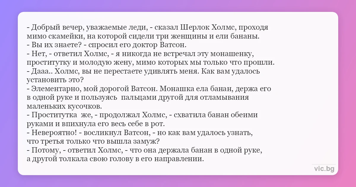 мимо скамейки, на которой сидели три женщины и ели бананы. - Вы их знаете? - спросил его доктор Ватсон. - Нет, - ответил Холмс, - я никогда не встречал эту монашенку, проститутку и молодую жену, мимо которых мы только что прошли. - Дааа.. Холмс, вы не перестаете удивлять меня. Как вам удалось установить это? - Элементарно, мой дорогой Ватсон. Монашка ела банан, держа его в одной руке и пользуясь пальцами другой для отламывания маленьких кусочков. - Пpoctиtуtka же, - продолжал Холмс, - схватила банан обеими руками и впихнула его весь себе в рот. - Невероятно! - восликнул Ватсон, - но как вам удалось узнать, что третья только что вышла замуж? - Потому, - ответил Холмс, - что она держала банан в одной руке, а другой толкала свою голову в его направлении.