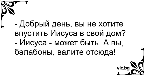 - Добрый день, вы не хотите впустить Иисуса в свой дом?<br />- Иисуса - может быть. А вы, балабоны, валите отсюда!